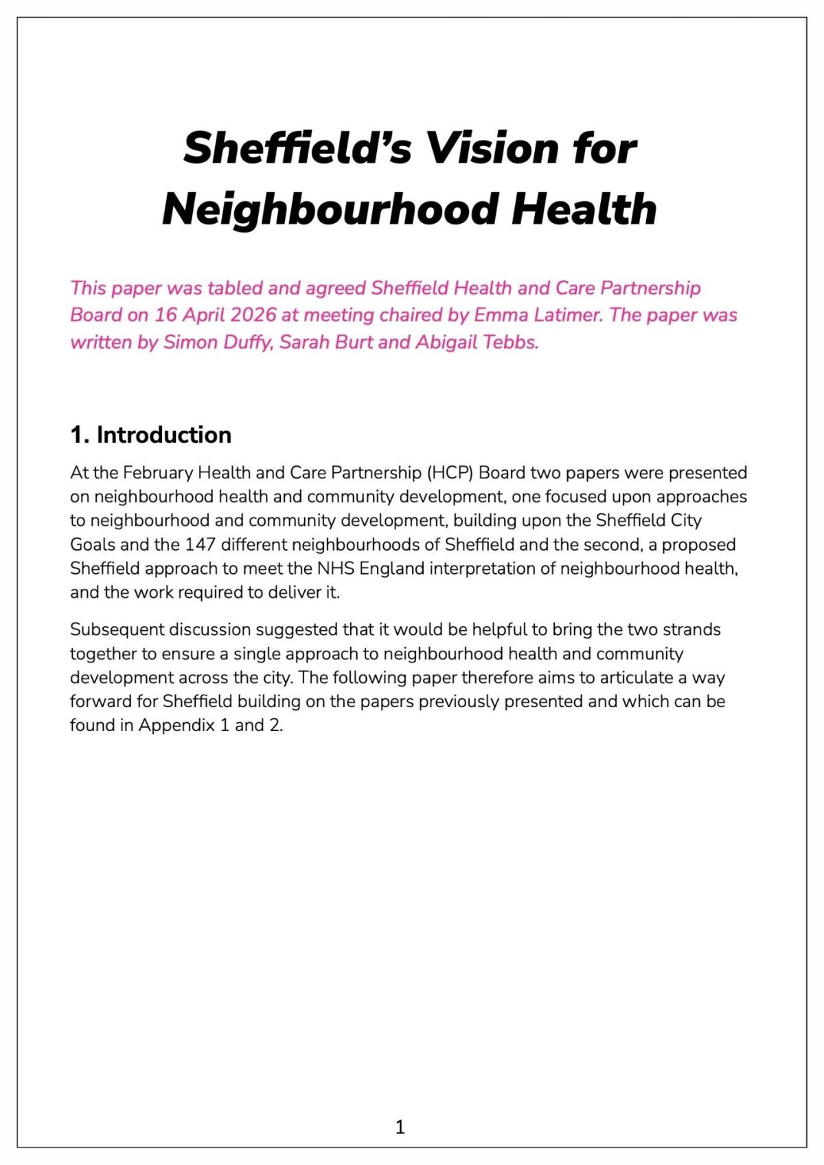 The paper was discussed and agreed at the Health and Care Partnership Board on the 16th April 2026. Further work on the future governance in Sheffield given the current changes to the organisation of the NHS in South Yorkshire. However all partners agreed that any future of place-based work in Sheffield must build on the foundations of the 147 neighbourhoods and the principles set out in this paper.
