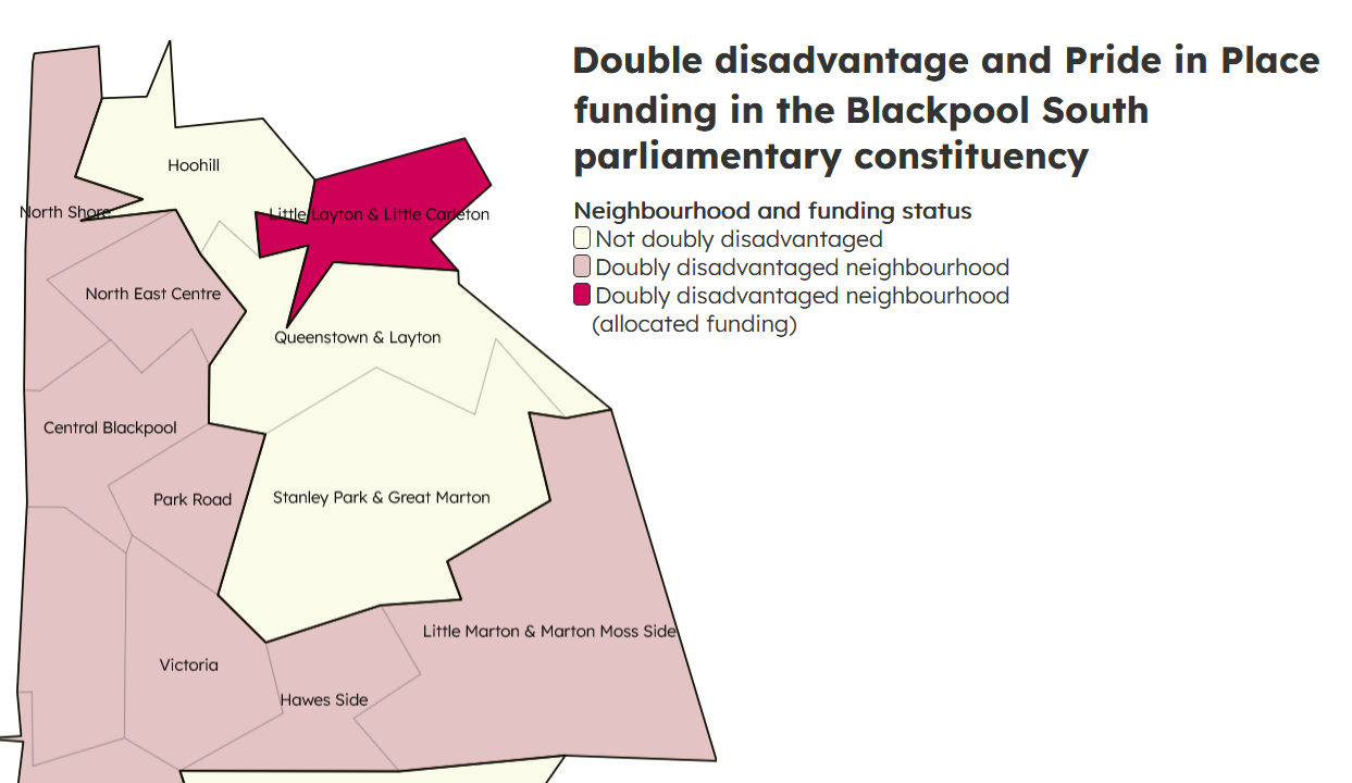 This image is of a Pride In Place neighbourhood in Blackpool. One neighbourhood (coloured in dark red) has gained £20million of funding while other neighbourhoods in the same area with similar levels of challenge (in light red) haven’t received anything through the programme.